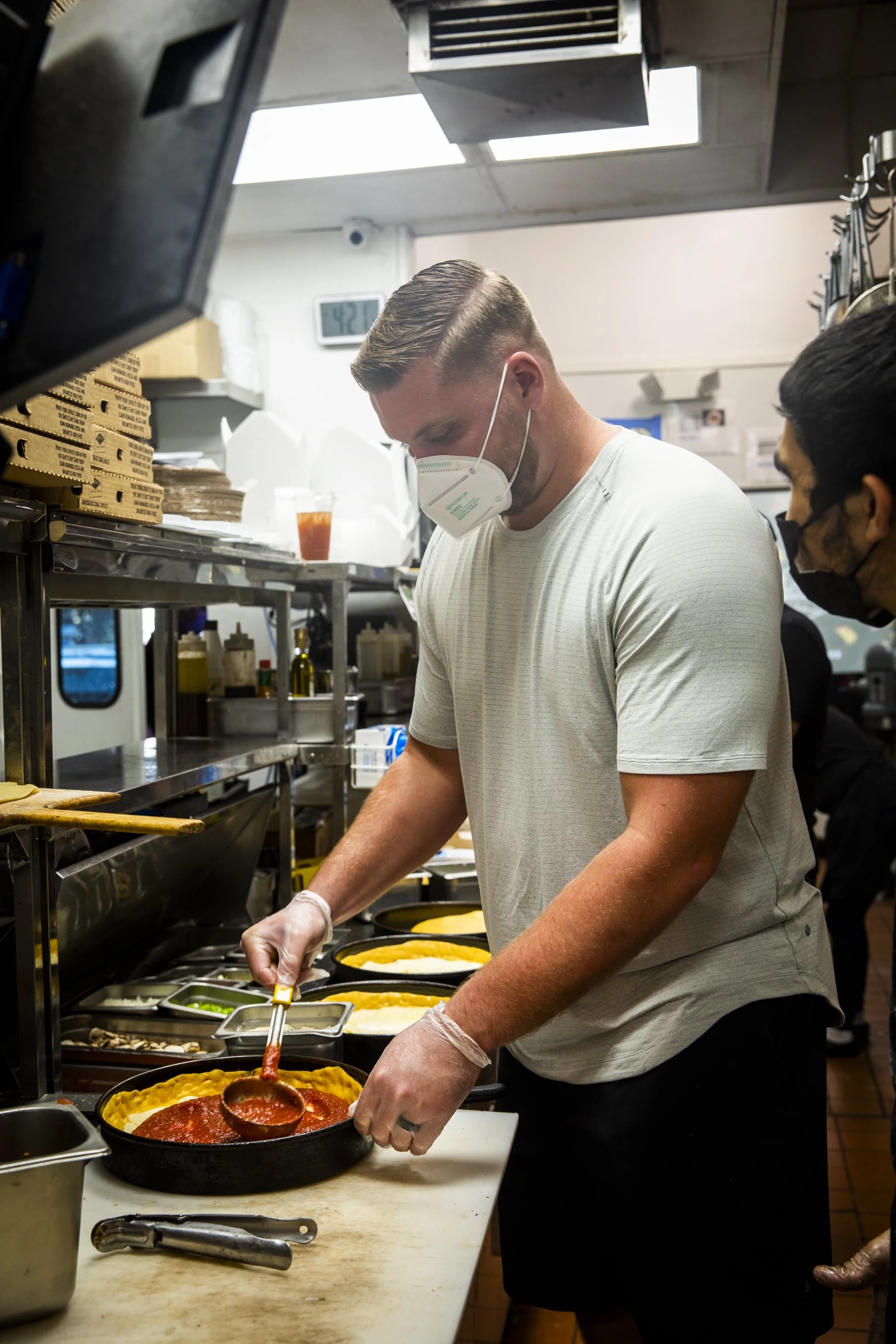 National Pizza Month 2021 – we collaborated with David Edwards of the LA Rams to create a specialty pizza; The Left Giard. Though the Super Bowl champ currently lives & plays in Los Angeles, David’s a Chicago native whose love for Gino’s East runs deep. We arranged a meet & greet event at Gino’s East LA to launch the pizza.